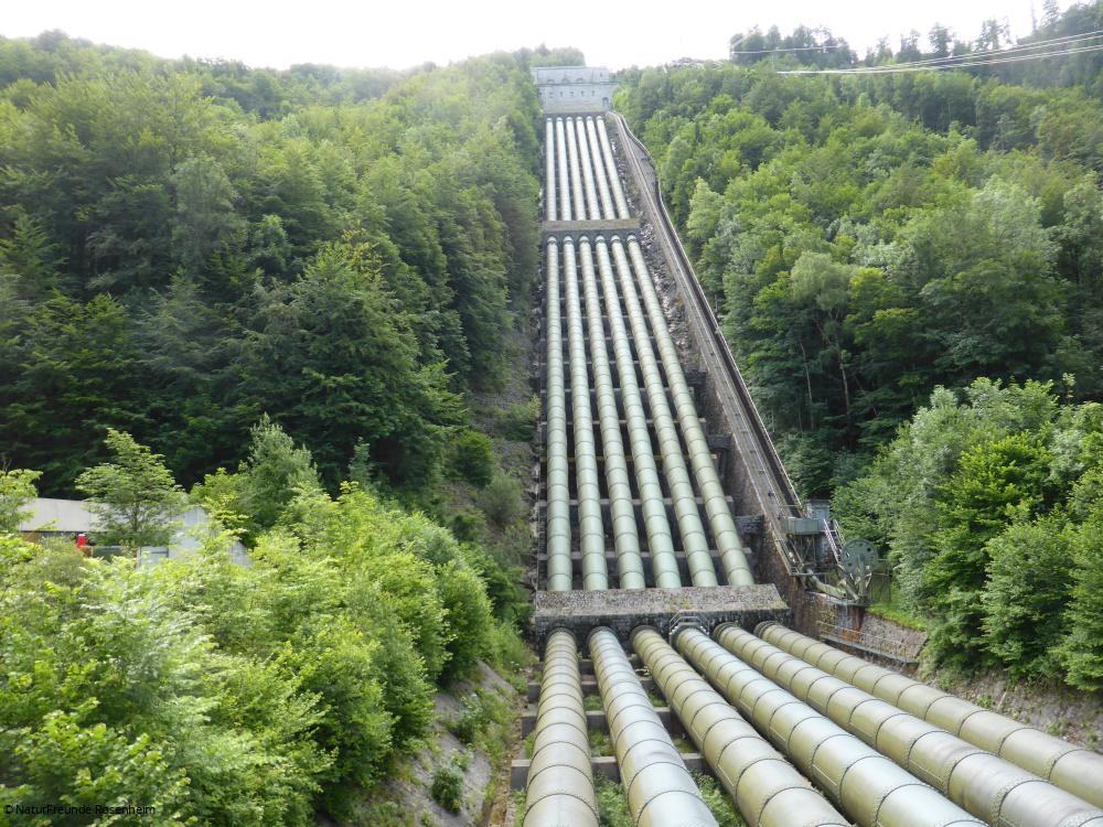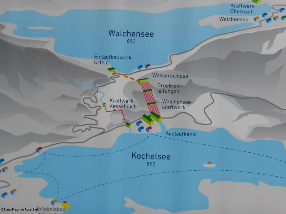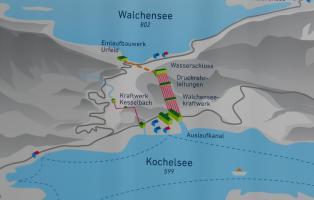 Die erste Station unserer "Fahrt ins Blaue" war eines der größten Hochdruck-Speicher-Kraftwerke Deutschlands: das Walchensee-Kraftwerk in Kochel. „Die weiße Kohle“ nannte Oskar v. Miller die Wasserkraft, den wertvollsten Bodenschatz Bayerns. Durch ein ausgeklügeltes System wird Wasser aus dem Walchensee mit einem Gefälle von circa 200 Meter durch Rohrverbindungen zu den Generatoren des Kraftwerks geleitet und fließt dann in den Kochelsee ab.