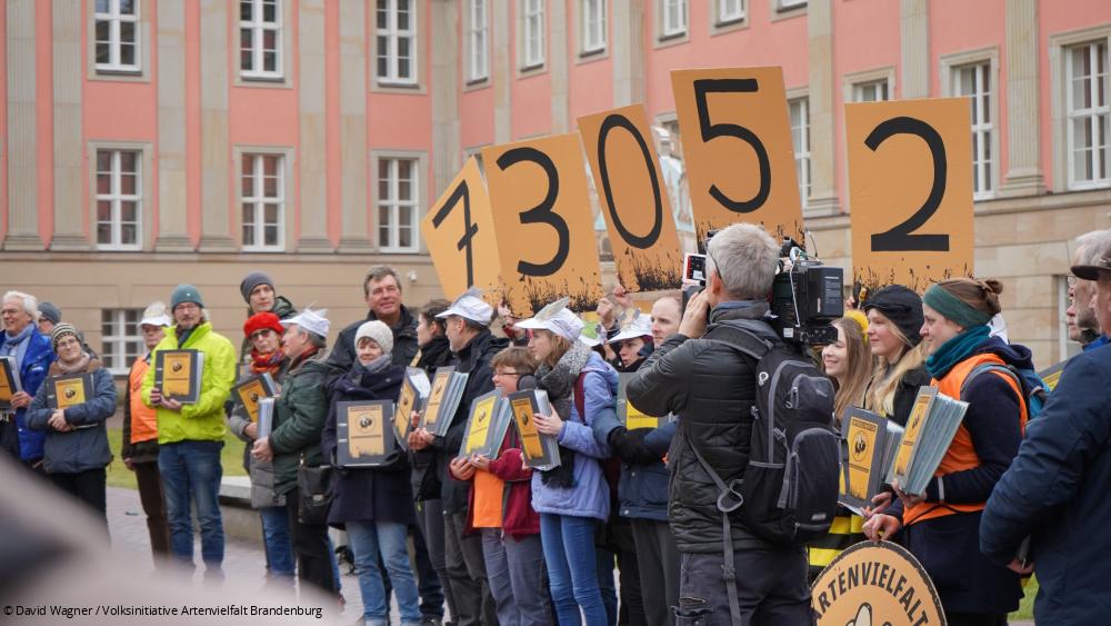 Knapp neun Monate nach dem Start der Volksinitiative „Artenvielfalt retten – Zukunft sichern!“ haben die NaturFreunde Brandenburg gemeinsam mit weiteren Umwelt- und Landnutzungsverbänden 73.052 Unterschriften an den brandenburgischen Landtag überreicht. Die Landtags-Vizepräsidentin nahm am 13. Januar 42 Aktenordner mit ausgefüllten Unterschriftenlisten entgegen.