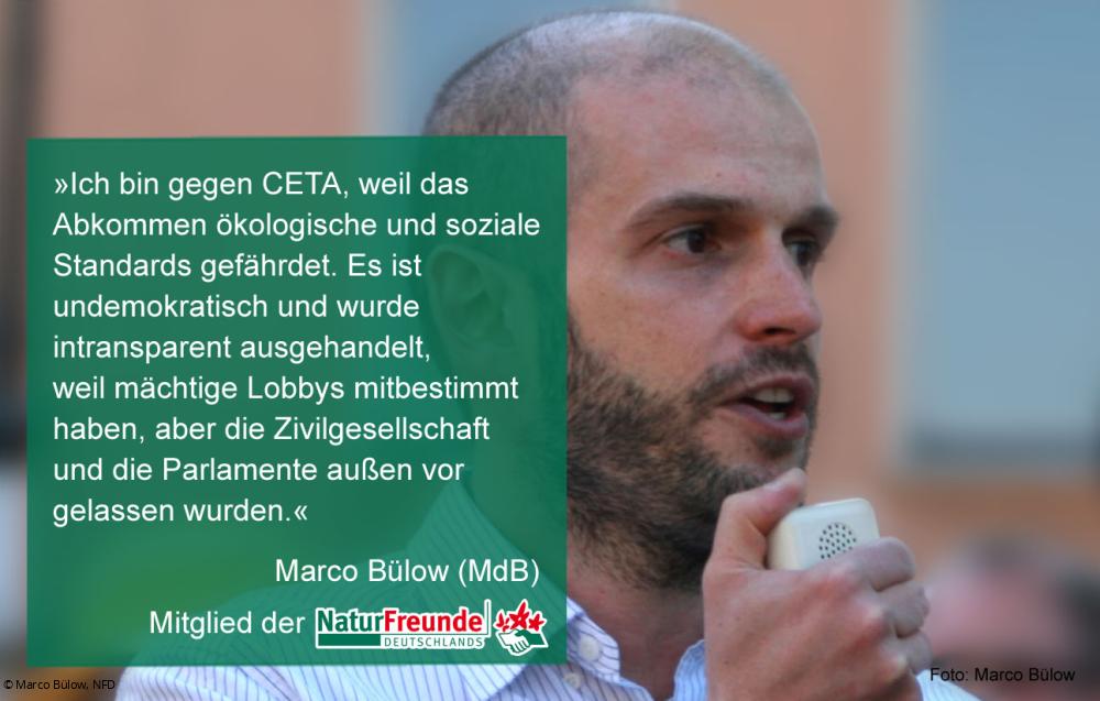 Uwe Hiksch, Mitglied im Bundesvorstand der NaturFreunde Deutschlands und im bundesweiten Arbeitsausschuss für die sieben Großdemonstrationen appelliert nochmals an die SPD: „Wir NaturFreunde fordern die sofortige Beendigung der Geheimverhandlungen für das Freihandelsabkommen TTIP und die Ablehnung des neoliberalen Freihandelsabkommens CETA. Zwei Tage vor dem SPD-Konvent in Wolfsburg appellieren wir noch einmal an alle Delegierten, CETA abzulehnen.“