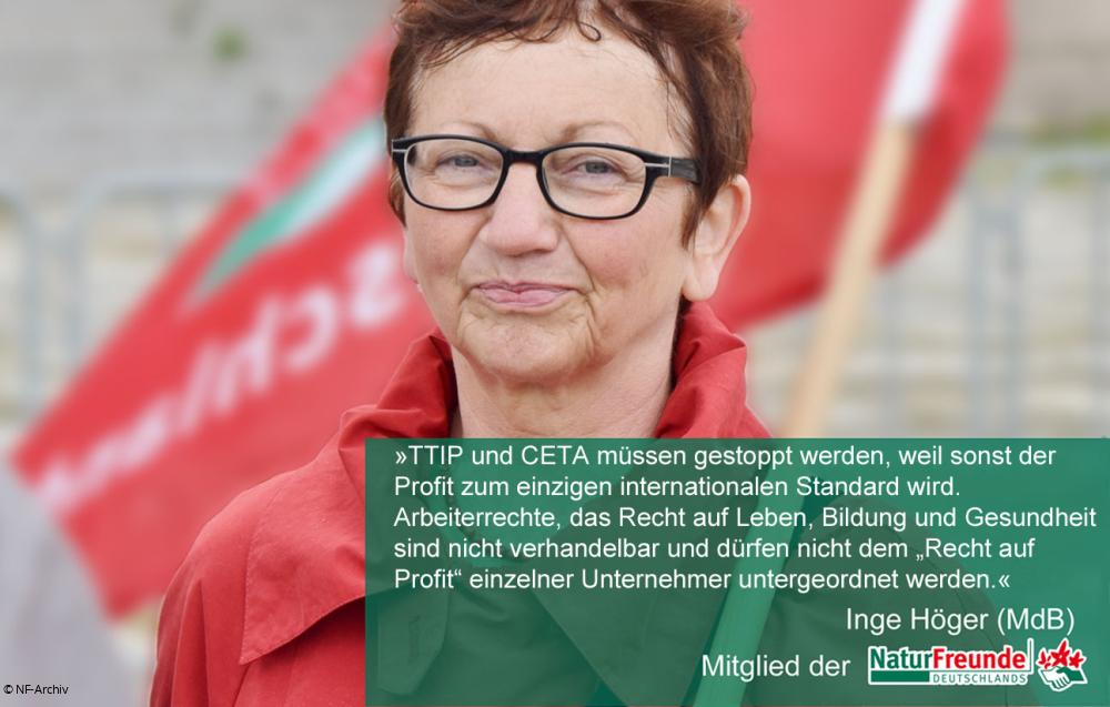 „Die geplanten Abkommen sind das geistige Produkt der neoliberalen Deregulierung – einer Ideologie, die im Jahr 2008 in die Finanzkrise geführt hat", erklärte Michael Müller, Bundesvorsitzender der NaturFreunde Deutschlands und Auftaktredner der Demo in Berlin: "Die Hauptverantwortlichen und die ideologischen Träger der Freihandelsabkommen sind die Union und auch Bundeskanzlerin Angela Merkel. Umso mehr richtet sich die Hoffnung auf die SPD. Sie muss die Verträge stoppen, wenn sie ihrer Verantwortung gerecht werden will."