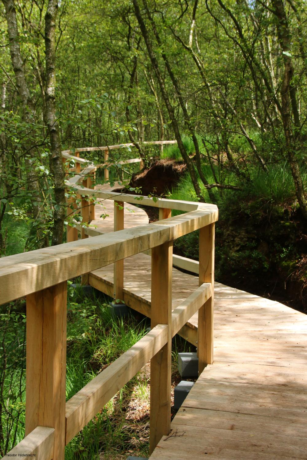 Allein für den 270 Meter langen Bohlenweg schleppten 24 Freiwillige drei Wochen lang jeweils einen Zentner schwere Eichenbohlen in das Moor. Nun führt der massive Weg mit Handlauf um den „Knust“ herum, den höchsten Teil des Moores, der in einem Schichtenmodell aufgelassen wurde. Die schwimmende Konstruktion schützt sowohl den morastigen Torfboden als auch den Holzweg. Auch der große Unterstand wurde massiv aus Holz gebaut und das Dach begrünt.