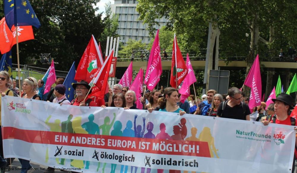 Insofern schlugen zwei Herzen in der Brust von vielen Demonstrierenden: Wir dürfen die EU nicht den zerstörerischen Kräften von Rechts überlassen. Und wir wollen ein anderes Europa. Dieser Zwiespalt war auch vielen NaturFreunde-Redner*innen anzuhören.