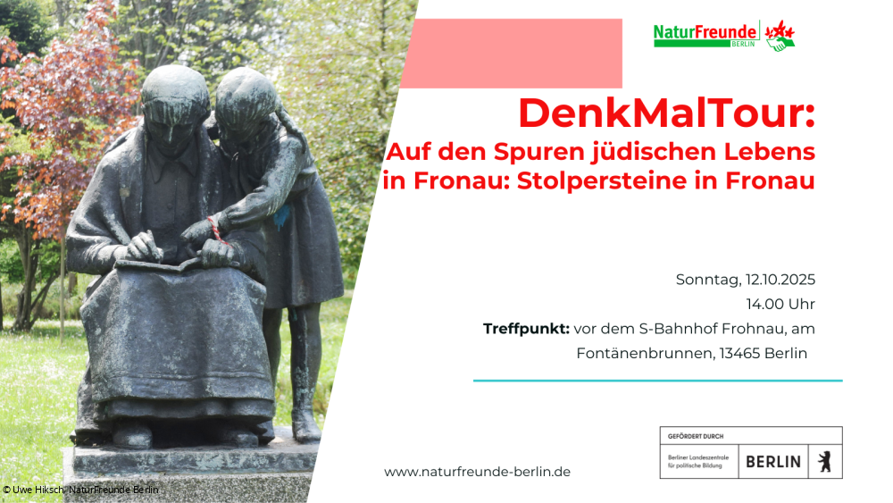 Seit mehreren Jahren führen die NaturFreunde Berlin im Rahmen ihrer Reihe „DenkMalTour“ „Stolpersteintouren“ durch. Bei den Touren vermitteln die Aktiven Informationen über das Leben und das Wirken der Menschen, für die die Stolpersteine initiiert wurden, und zeichnen den Nazi-Terror nach.