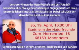 Zum zehnten Todestag von Elke Kammigan-Bentzinger († 27.04.2016) laden wir herzlich zu einer Gedenkveranstaltung ein. Gemeinsam möchten wir auf das Leben und Wirken von Elke Kammigan-Bentzinger zurückblicken. Die Veranstaltung richtet sich an alle, die Elke kannten, ebenso wie an diejenigen, die sie nicht persönlich erlebt haben. Vertreter*innen der NaturFreunde und der VVN-BdA berichten über Elkes jahrzehntelanges Engagement und ihren unermüdlichen Einsatz als Antifaschistin. Dabei soll auch der Mensch Elke nicht zu kurz kommen.