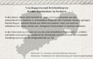 In den letzten Jahren sind vermehrt Gruppen und Einzelpersonen aus den unterschiedlichen Spektren in verschiedene Regionen des Freistaats Sachsen gezogen: Rechte Rapper, extreme Rechte aus NRW und anderen Orten und auch ein selbsternannter König möchte sein „Königreich Deutschland“ in Sachsen etablieren. In der Veranstaltung schauen wir uns die unterschiedlichen Phänomene an, erörtern und damit einhergehenden Gefahren für Demokratie und Gesellschaft und entwickeln Handlungsoptionen für die Zivilgesellschaft vor Ort.