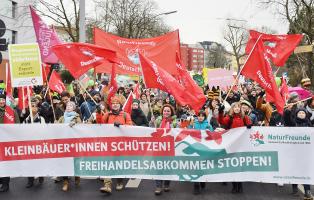 Die europäische und deutsche Agrarpolitik sind so mitverantwortlich für ungerechte Landverteilung, ungleichen Zugang zu Ressourcen und die Zerstörung der regionalen Strukturen, die in vielen Ländern zu Hunger, Armut und Flucht führen (siehe Beschluss des 30. Bundeskongresses). Die Forderung auf dem NaturFreunde-Banner lautete deshalb: "Kleinbäuer*innen schützen! Freihandelsabkommen stoppen!".
