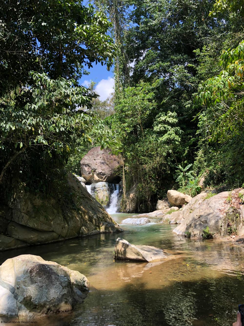 Am Versammlungsort angekommen, sind es Magda und Mitglieder des lokalen Wasserkomitees, die uns gleich zum Fluss Jilamito führen. Mittlerweile steht die Sonne hoch oben und die Luft ist feucht. Zum Glück ist es nur ein kurzer Fußmarsch bis zum Fluss. „Das Wasser ist so sauber, dass wir es zum Trinken benutzen“, erklärt Calixto vom Wasserkomitee und schöpft mit einer abgeschnittenen Plastikflasche etwas Wasser aus dem Fluss. „Als hier begonnen wurde, ein Wasserkraftwerk zu bauen, war das Wasser verschmutzt“, führt er weiter aus. Die Trinkwasserversorgung von 30.000 Personen in den umliegenden Gemeinden hängt von dem Fluss Jilamito ab. "Das war der Grund, weshalb wir uns vor sechs Jahren organisiert haben und für den Schutz des Flusses kämpfen", erklärt Calixto und führt weiter aus: "FundAmbiente unterstützt uns mit Aufklärungsarbeit zu unseren Rechten." Im Rahmen des geförderten Projektes werden die Personen in Jilamito unterstützt, die sich für den Erhalt des ökologischen Zustands des Flusses einsetzen. FundAmbiente stellt die Kontakte zu lokalen und regionalen Behörden her, um die Rechte der Umweltverteidiger*innen auf Mitbestimmung in den Gemeinden einzufordern.